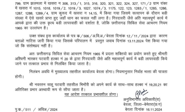 बेमेतरा/बेरला:- शासन के निर्देशानुसार पटवारियों द्वारा किये गए फसल गिरदावरी का जिला स्तरीय तथा ब्लॉक स्तरीय अधिकारीयों द्वारा सत्यापन कराया गया, गिरदावरी सत्यापन मे ग्राम कठीया, पेंड्री, झलमला, राका तथा कुरुद के विभिन्न खसरा नम्बरो मे हल्का पटवारी अश्विनी भास्कर द्वारा त्रुटि पूर्ण गिरदावरी करना पाया गया। जिस के कारण अनुविभागीय अधिकारी (रा.) बेरला द्वारा सम्बंधित को कारण बताओ नोटिस जारी किया गया था जवाब संतोषप्रद नही होने के कारण आज शनिवार को छत्तीसगढ़ सिविल सेवा आचरण नियम 1965 में प्रदत्त शक्तियो का प्रयोग करते हुए श्रीमती अश्विनी भास्कर पटवारी हल्का नं 20 के द्वारा गिरदावरी जैसे अति महत्वपूर्ण कार्य में बडी लापरवाही किये जाने पर तत्काल प्रभाव से निलंबित कर दिया गया। इनका निलंबन अवधि में मुख्यालय तहसील कार्यालय बेरला होगा। इन्हें नियमानुसार निर्वाह भत्ता की पात्रता होगी। नवरतन साहू पटवारी तहसील भिभौरी को उनके कार्य के साथ-साथ हल्का नं 19,20,21 का अतिरिक्त प्रभार अस्थायी रूप से सौपा गया है।