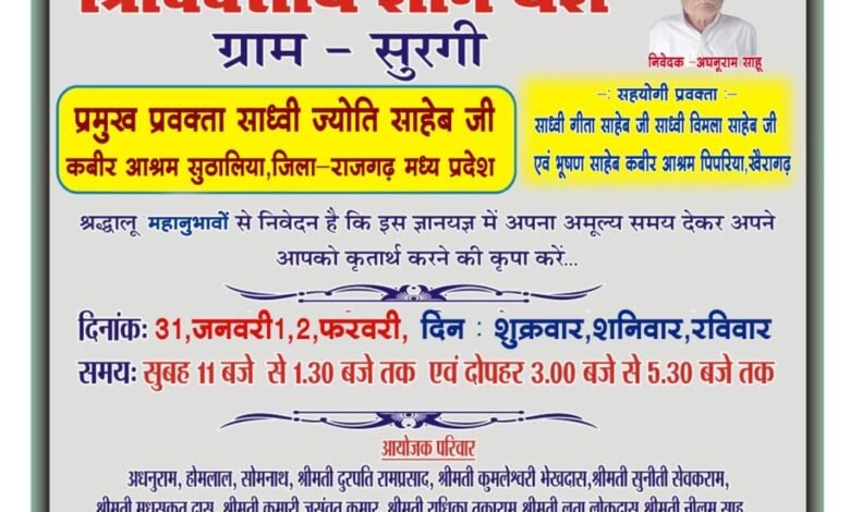राजनांदगांव:- जिला मुख्यालय क्षेत्र अंतर्गत आने वाले ग्राम सुरगी में त्रिदिवसीय ज्ञान यज्ञ का आयोजन किया गया है। जिसके प्रमुख प्रवक्ता साध्वी ज्योति साहेब जी कबीर आश्रम सुठालिया, जिला राजगढ़ मध्यप्रदेश के है। वही सहयोगी प्रवक्ता साध्वी गीता साहेब जी साध्वी विमला साहेब जी एवं भूषण साहेब कबीर आश्रम पिपरिया, खैरागढ़ करेंगे।कार्यक्रम दिनाँक 31 जनवरी से 2 फरवरी रविवार तक होंगे। त्रिदिवसीय में होने वाले कार्यक्रम के समय सारणी सुबह 11 बजे से 1:30 बजे तक एवं दोपहर 3 बजे से 5:30बजे तक होंगे। सहित सह परिवार उपस्थिति त्रिदिवसीय ज्ञान यज्ञ का लाभ लेवे ।