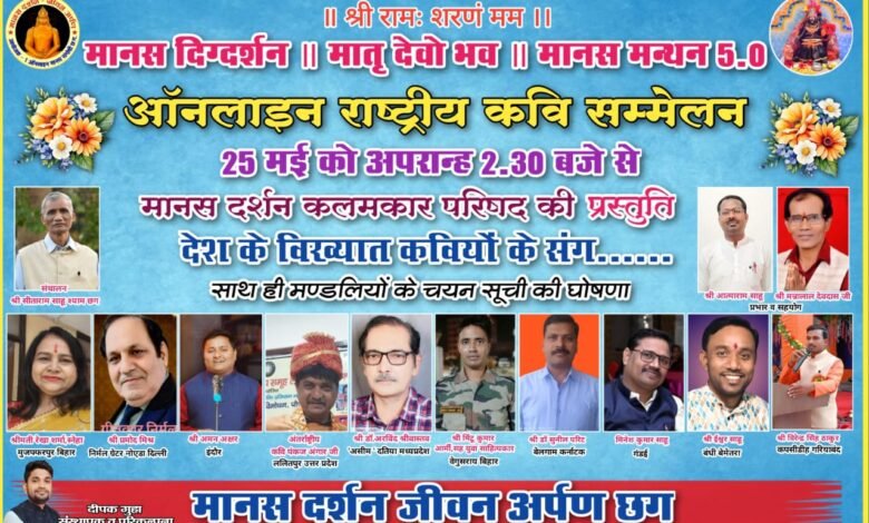 बेमेतरा:- मानस दर्शन ने ऑनलाइन राष्ट्रीय कवि सम्मेलन का आयोजन किया। जिसमें मानस दर्शन जीवन अर्पण छत्तीसगढ़ सहित एशिया का प्रथम ऑनलाइन पटल जो विगत 7 वर्षों से श्री राम कथा के साथ-साथ विविध प्रकार से नवाचार आयोजन करता रहा है। यह 5 मई 2025 से 23 मई 2025 तक 19 दिवसीय ऑनलाइन मानस प्रतियोगिता मातृ देवो भव मानस मंथन 5.0 के समापन पश्चात 25 मई को अंतरराष्ट्रीय काव्य गोष्ठी, कवि सम्मेलन, मानस दर्शन कलमकार परिषद् की प्रस्तुति, देश के विख्यात कवियों के संग का आयोजन किया गया। जिसमें रेखा शर्मा, स्नेहा मुजफ्फरपुर बिहार, प्रमोद मिश्रा निर्मल ग्रेटर नोएडा दिल्ली, अमन अक्षर इंदौर, अंतरराष्ट्रीय कवि पंकज अंगार जी ललितपुर उत्तरप्रदेश, डॉक्टर अरविन्द श्रीवास्तव असीम दतिया मध्यप्रदेश, मिंटू कुमार आर्मी सह युवा साहित्यकार बेगूसराय बिहार डॉ सुनील परीट, बेलगाम कर्नाटक, मिनेश कुमार साहू जी गंडई , ईश्वर साहू जी बंधी बेमेतरा, वीरेंद्र सिंह ठाकुर कपसीडीह, गरियाबंद ने अपनी अपनी उत्कृष्ट कविता पाठ कर श्रोताओं को भाव-विभोर कर दिया। कवि सम्मेलन के प्रभारी आत्मा राम साहू धड़कन मानस दर्शन परिवार एवं मुन्नालाल देवदास, कवि, साहित्यकार, गीतकार थे। कवि सम्मेलन का संचालन छत्तीसगढ़ के वरिष्ठ साहित्यकार, गीतकार, लोकगायक एवं राष्ट्रपति पुरस्कार से सम्मानित सीताराम साहू जी श्याम ने किया।