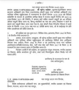 निलंबन आदेश के बाद कलेक्टर दिव्या उमेश मिश्रा के निर्देश पर अपर कलेक्टर चंद्रकांत कौशिक ने डौंडी तहसीलदार देवेंद्र नेताम को नगर पालिका परिषद दल्लीराजहरा के मुख्य नगर पालिका अधिकारी का संपूर्ण प्रभार आगामी आदेश तक सौंपने का आदेश जारी किया है। यह आदेश छत्तीसगढ़ शासन, नगरीय प्रशासन एवं विकास विभाग, मंत्रालय महानदी भवन, नवा रायपुर अटल नगर के 10 फरवरी 2026 के आदेश के तहत जारी किया गया है।