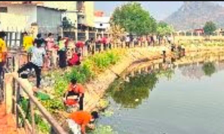 शीतला तालाब में तीन घंटे की सफाई में निकली शराब की बोतलें और प्लास्टिक